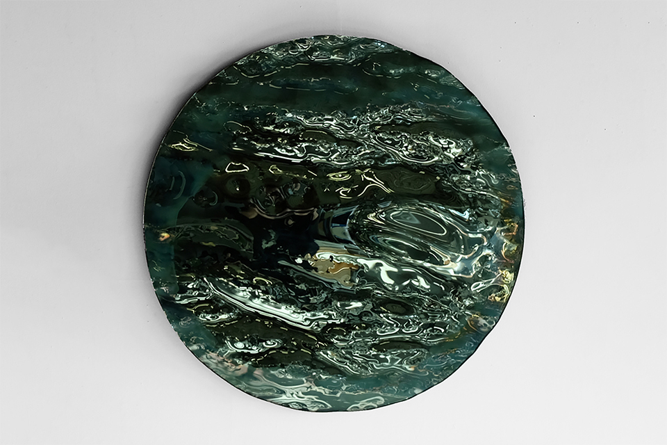 Glaz, is a mirror inspired by the destructive wave phenomenon in the ocean. When two waves meet in such a way that the crest of one wave meets the trough of another, the result is a lower amplitude. The title Glaz, is a reference to the water color of the ocean in Brittany, this is a specific color, a mix of green, blue and grey.